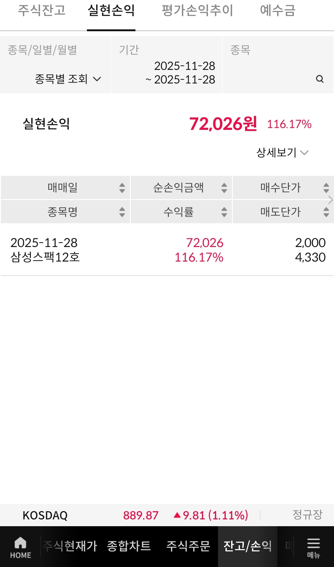 | 2025/12/1 미래에셋비전스팩9호 매도 / +72,285 (0) | 2025.12.01 |