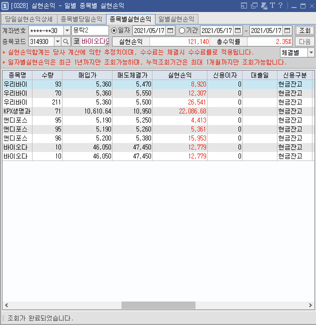 화이자 관련주. 원래는 KPX생명과학을 가지고 오고있었는데.. 전날 상승할 때 우리바이오가 힘이 더 좋아보여서 KPX를 일부 매도하고 우리바이오로 갈아탔음. 오늘 장 반등할 때 올라오길래 목표가에는 아직 미달이긴 하지만 일단 수익 취하고 다시 재진입.
