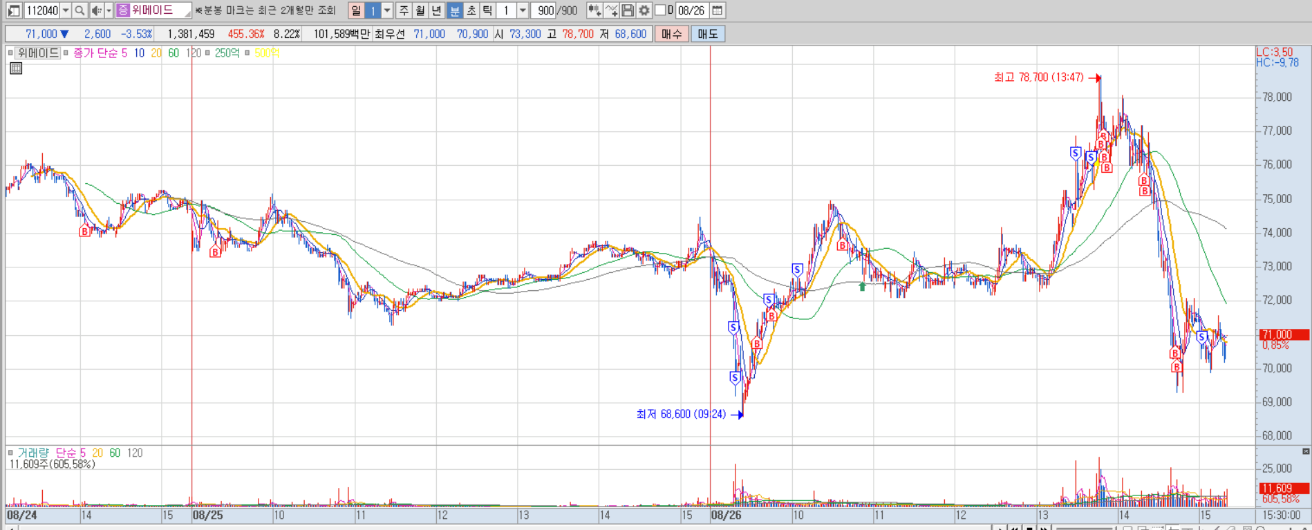 오늘 엔씨가 죽으면서 다른 게임주들(펄어비스, 카카오게임즈)이 반사이익(?)으로 떡상을 했다.. 난 그저께부터 위메이드 모아가고 있었기에 주시하는데 아침에 갑자기 훅 빼더라? 하.. 그래서 저점에서 한번 털리고 올라올 때 살짝살짝 짤짤이로 대응하다가 장후반에 급등하길래 펄어비스 상가는 시나리오 생각해서 위메이드 키맞추기 매매를 했다. 그런데 장막판에 -8%를 빼더라 미친것..ㅋㅋ 비중 조절을 위해서 일단 반만 손절..ㅠ 위메이드에서 개털렸네 오늘.