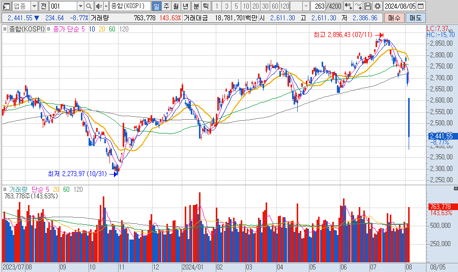 실업률이 올라갔느니.. 엔캐리 트레이드때문이니..일본 금리 인상이니 뭐니... 하지만 결국은 여태 많이 올랐으니까 내리는거다. 통상 금리를 올리면 자금이 예금 등 안전자산으로 몰려서 주식시장에 빠져야 정상인데, 오히려 올라가는 기이한 진풍경을 맛봤으니까. (특히 미국 나스닥, 다우)