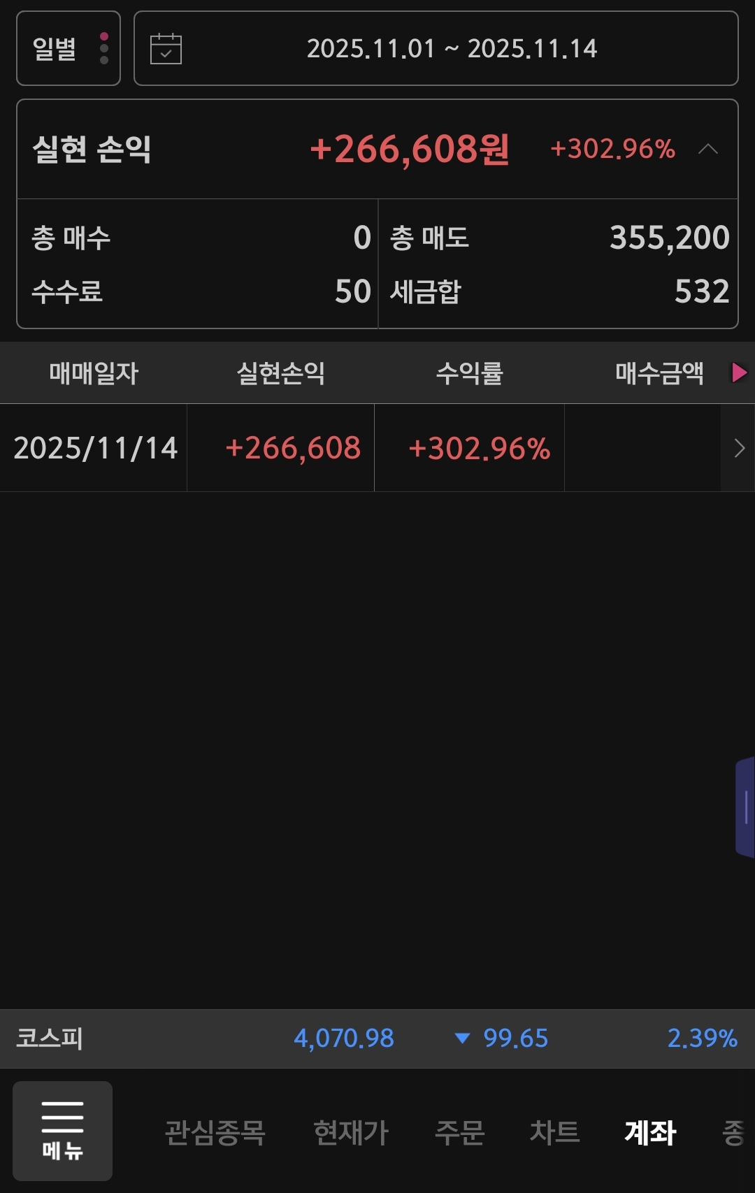 | 2025/11/14 세나테크놀로지 매도 / +157,494 (0) | 2025.11.14 |